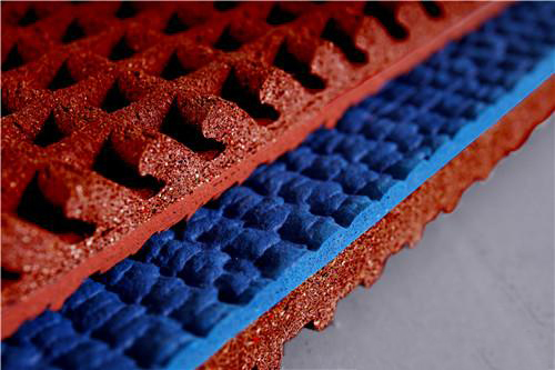 預制型橡膠跑道系列是一種雙層一體結構的環(huán)保型橡膠卷材,上層為高韌性耐磨面層,面層深度為1-2mm的無規(guī)則花紋是由特制的專業(yè)設備連續(xù)壓延而成,保證為運動員提供足夠的足底摩擦力。下層為高彈性底層,底層為具有合理傾斜角度的水滴狀蜂巢結構的微孔發(fā)泡層。這種幾何結構能夠很好地配合微孔發(fā)泡的精密配方,能提供卓越的沖擊吸收能力、平滑的能量過渡以及連續(xù)的能量反饋。彈性底層進行惰性氣體閉孔發(fā)泡后,形成的眾多微小的惰性氣體氣囊,保證了底層的高回彈性能。