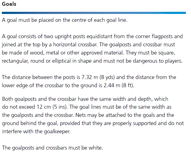 兩根球門(mén)柱和橫梁具有不超過(guò)12厘米(5英寸)的相同的寬度和厚度。球門(mén)線與球門(mén)柱和橫梁的寬度是相同的。球門(mén)網(wǎng)可以系在球門(mén)及球門(mén)后面的地上,并要適當(dāng)撐起以不影響守門(mén)員。